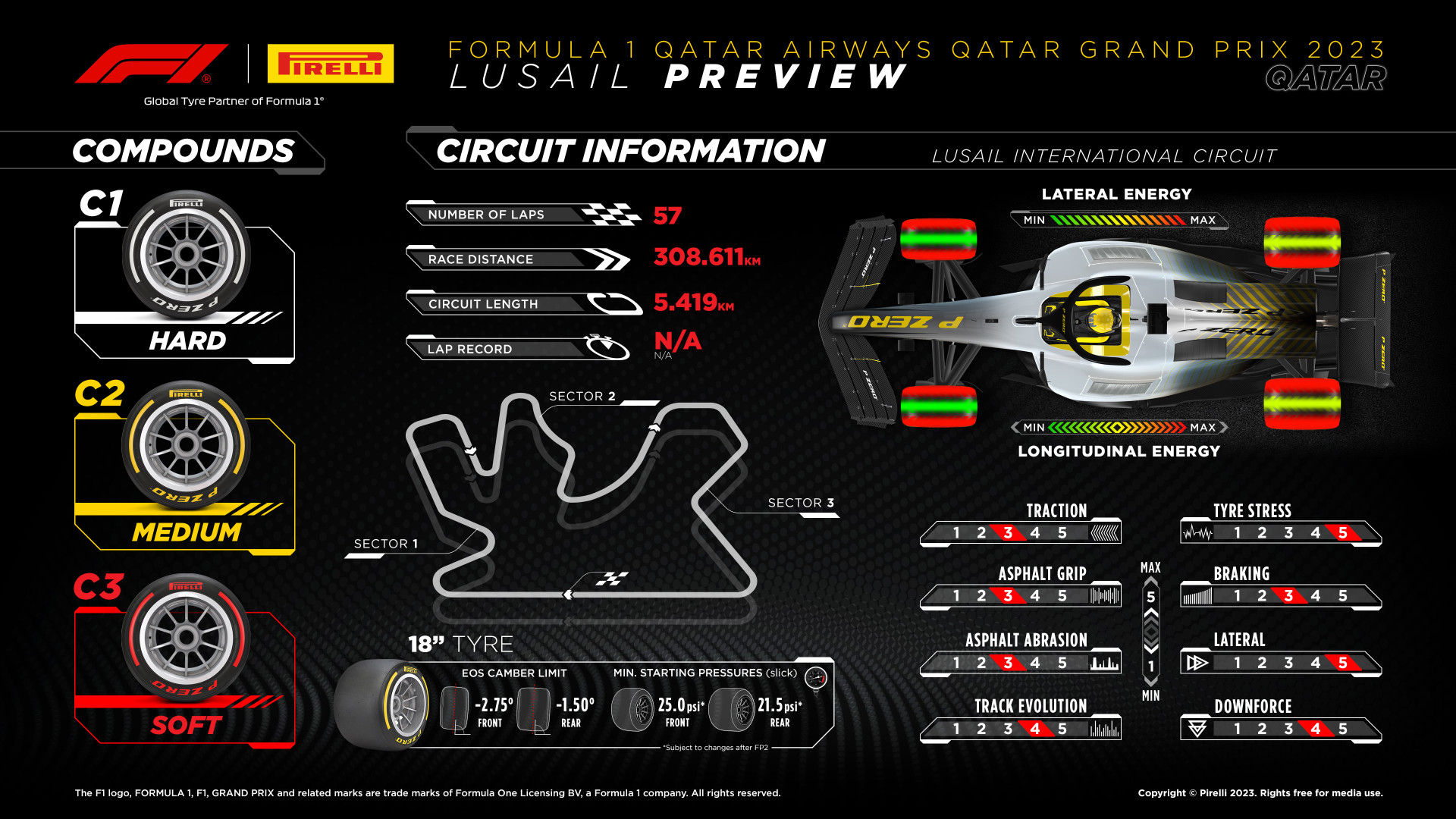 - Para o GP do Catar, as equipes terão C1 como P Zero Branco duro, C2 como P Zero Amarelo médio e C3 como P Zero Vermelho macio. Esta é a mesma indicação feita para a corrida anterior, no Japão.