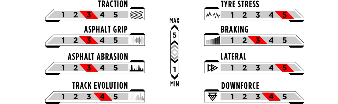 Em termos de desgaste, Losail é um circuito muito desafiador para os pneus, semelhante a Silverstone e Suzuka. Portanto, não é por acaso que os compostos escolhidos são os mesmos: C1, C2 e C3. Há uma grande variedade de curvas, a maioria delas de média e alta velocidade. A série de curvas entre a 12 e a 14 lembra bastante a famosa curva 8 em Istambul: uma das curvas mais exigentes para pneus na história recente da Fórmula 1. Essa sequência também é um dos fatores mais influentes para um bom tempo de volta. O fato de 11 das 16 curvas serem para a direita coloca um estresse especial na esquerda do carro, especialmente na dianteira, mas os níveis de energia vistos passando pelos pneus em 2021 ainda estavam bastante equilibrados entre os dois eixos.