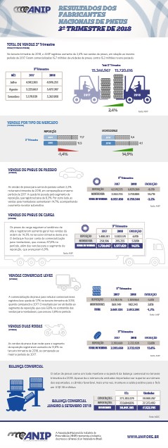 A ANIP (Associação Nacional da Indústria de Pneumáticos) registrou aumento de 2,4% nas vendas de pneus no terceiro trimestre de 2018 em relação ao mesmo período de 2017. Foram comercializadas 15,7 milhões de unidades de pneus, contra 15,3 milhões no ano passado.