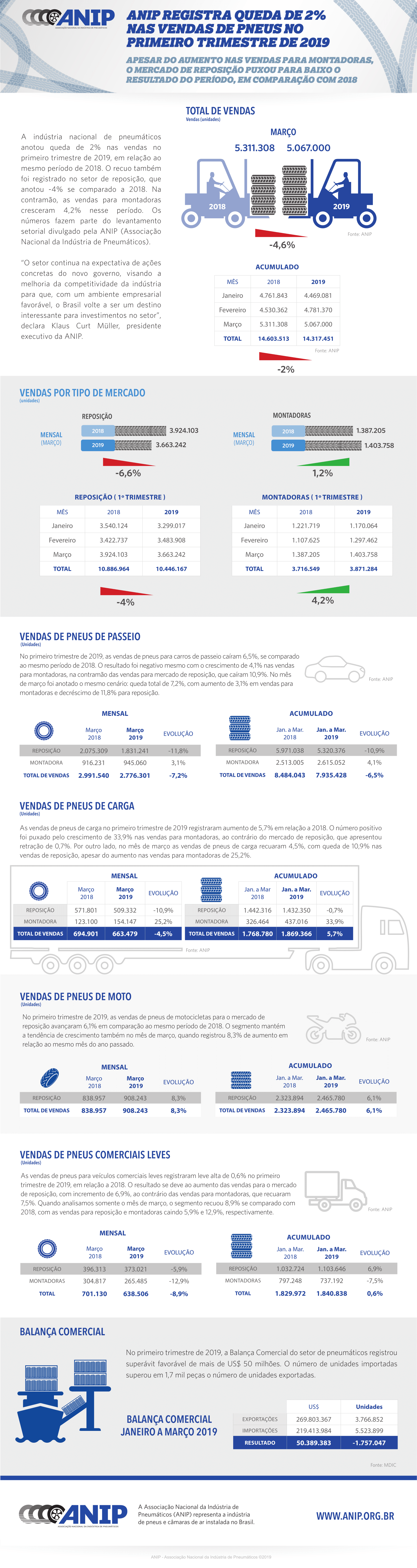 A indústria nacional de pneumáticos anotou queda de 2% nas vendas no primeiro trimestre de 2019, em relação ao mesmo período de 2018. O recuo também foi registrado no setor de reposição, que anotou -4% se comparado a 2018. Na contramão, as vendas para montadoras cresceram 4,2% nesse período. Os números fazem parte do levantamento setorial divulgado pela ANIP (Associação Nacional da Indústria de Pneumáticos).