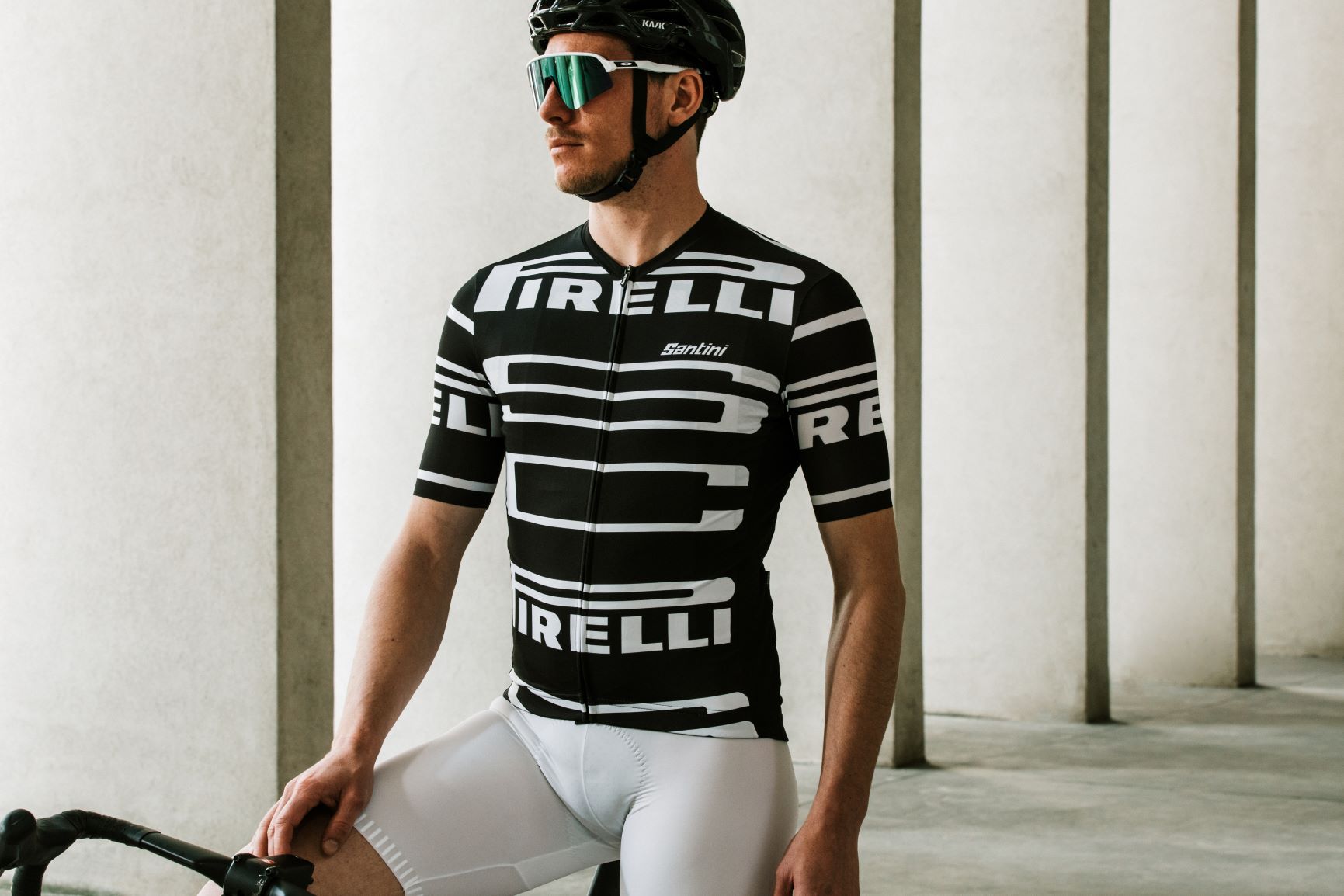 A coleção consiste em duas camisas de ciclismo, um par de short disponíveis em preto e branco, uma camada base, um colete sem mangas e uma jaqueta corta vento, além de acessórios correspondentes, incluindo meias, boné e garrafa de água. Também estarão disponíveis uma camiseta feita de tecido macio, misturando 95% algodão e 5% lycra, e um moletom com gola redonda, ambos com os logotipos da Santini e da Pirelli em silicone sutil em soft touch.