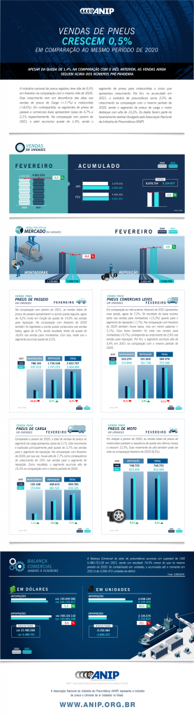 São Paulo, março de 2021- A Associação Nacional da Indústria de Pneumáticos (ANIP) divulga nesta quarta-feira (10) os resultados do levantamento setorial de vendas de pneus referente ao mês de março.