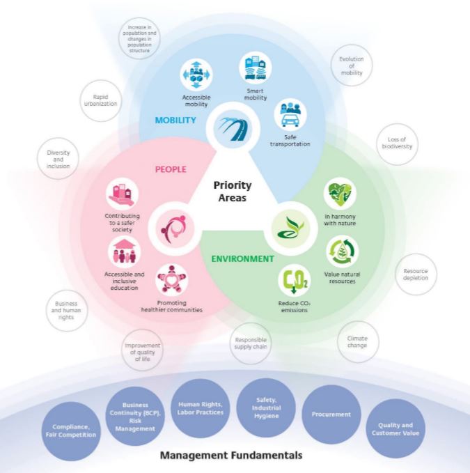 Bridgestone em três áreas prioritárias – Mobilidade, Pessoas e Meio Ambiente – para melhorar a mobilidade, a vida, o trabalho e o lazer das pessoas por meio de iniciativas de inovação e tecnologia. Juntamente com essas áreas prioritárias, o Grupo continua fortalecendo elementos básicos de governança, conformidade regulatória e comportamento esperados de qualquer empresa responsável, pelo que chamamos de Princípios de Gestão.
