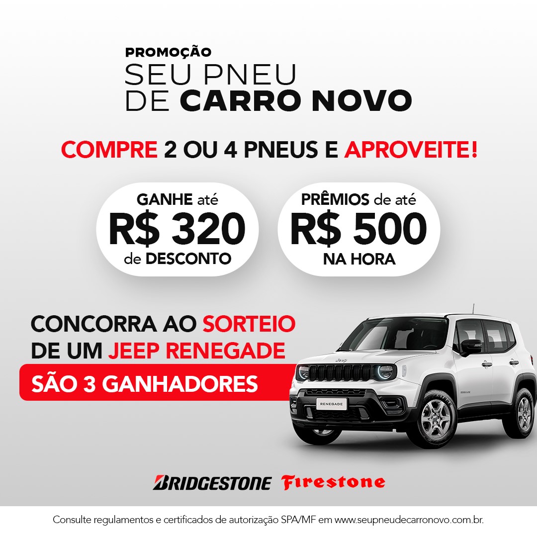 SÃO PAULO, 1º de julho de 2024 – A Bridgestone anuncia a campanha “Seu Pneu de Carro Novo”. Ao todo serão sorteados 3 Jeep Renegade para os clientes que comprarem pneus das marcas Bridgestone e Firestone até o dia 31 de julho. As notas fiscais para concorrer ao principal prêmio poderão ser cadastradas no site da promoção até o dia 05/08 – cinco dias após o final da promoção.