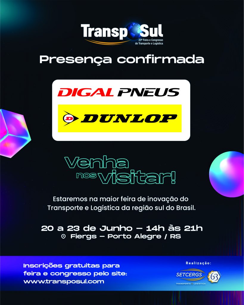 Marcada para acontecer entre os dias 20 e 23 de junho, a 23ª edição da Transposul contará com a Digal Pneus, distribuidor exclusivo da Dunlop no Rio Grande do Sul.