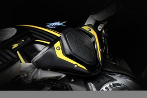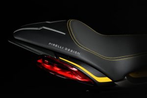 Pela primeira vez a Pirelli Design, nascida como uma incubadora de projetos de ponta com o objetivo de aumentar o know-how tecnológico, os padrões de alta performance e o glamour único inerente à marca Pirelli, não apenas personaliza a aparência da moto com duas combinações de cores diferentes – a primeira, uma resoluta preta e amarela e a segunda, uma mais elegante branca e azul – mas também cuida de melhorar os aspectos funcionais da motocicleta. De fato, o protetor de tanque e a carenagem são de uma borracha formulada especialmente pelo Departamento de Pesquisa e Desenvolvimento da Pirelli para garantir uma resistência superior a arranhões e atritos aos quais esses itens estão sujeitos, além de agentes atmosféricos e químicos, como combustível. Ambos elementos de borracha são reconhecíveis graças ao icônico símbolo do “raio” que distingue os pneus da linha DIABLO™, incluindo o DIABLO™ Supercorsa SP que equipa este modelo nas medidas 120/70 ZR17 no dianteiro e 200/55 ZR17 no traseiro, cuja largura do aro é de 6 polegadas.