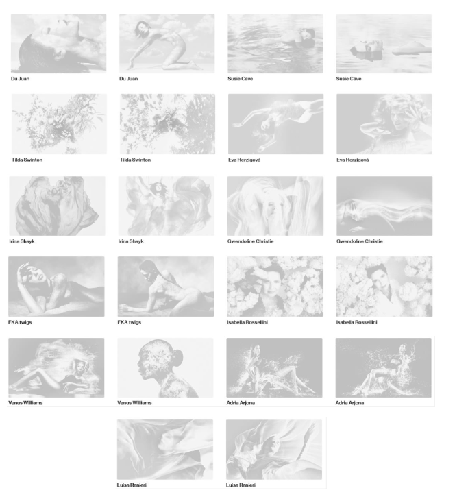 Adria Arjona, Du Juan, Eva Herzigová, FKA twigs, Gwendoline Christie, Irina Shayk, Isabella Rossellini, Luisa Ranieri, Susie Cave, Tilda Swinton, Venus Williams