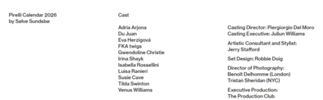 A edição de 2026, do fotógrafo norueguês Sølve Sundsbø, explora a conexão entre o ser humano e a natureza através dos “Elements”. As onze protagonistas são retratadas como encarnações simbólicas dos elementos naturais – terra, ar, fogo e água – mas também de forças mais intangíveis, como energia, éter e luz.