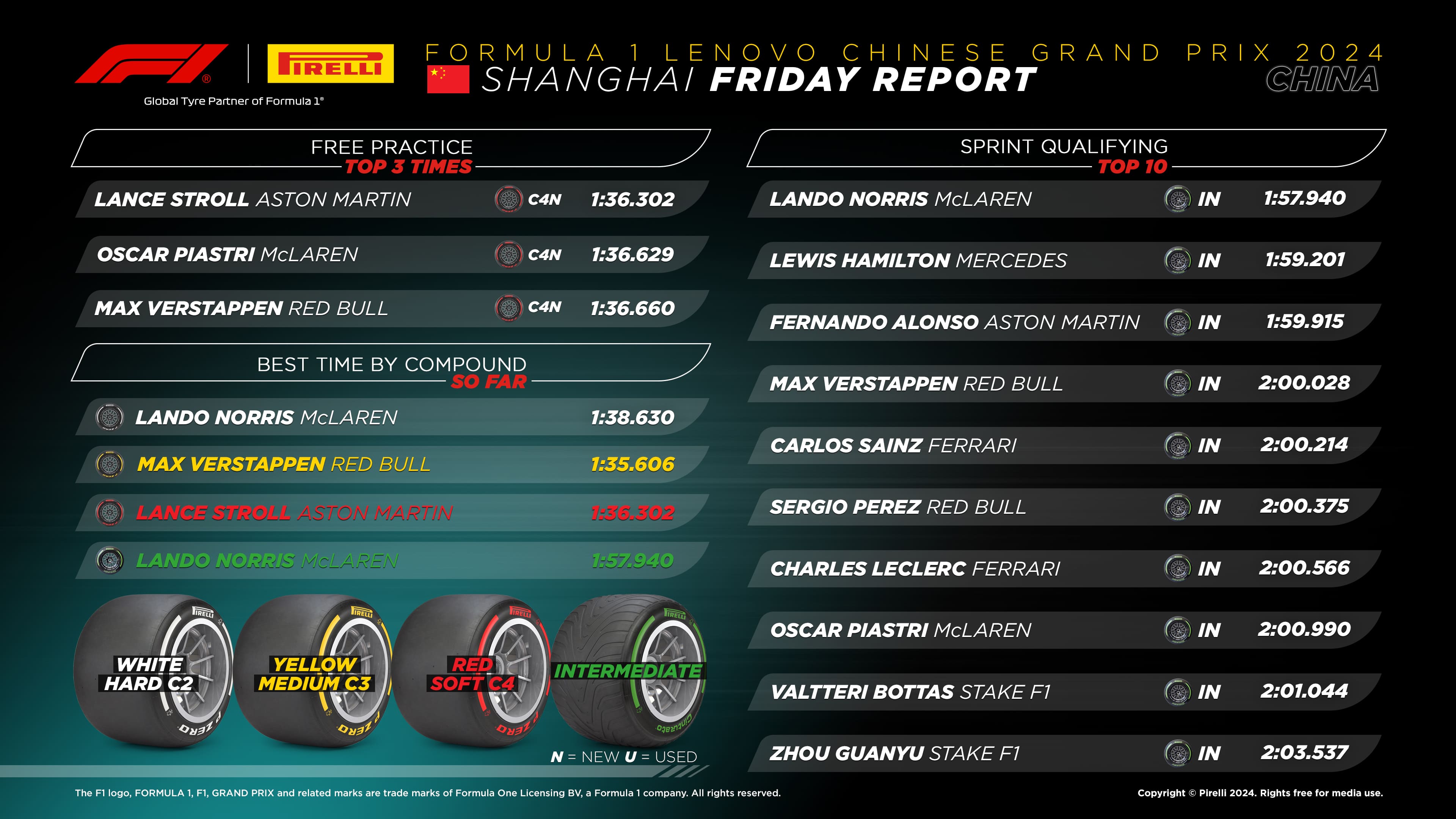 O primeiro dia do GP da China foi repleto de ação, com muitas surpresas especialmente na parte final da Classificação Sprint. Depois que algumas gotas de chuva começaram a cair no final do Q2, a parte final foi disputada em pista completamente molhada e com superfície muito escorregadia. Isso produziu oito minutos espetaculares e emocionantes, com saídas da pista, grandes correções nos volantes, ótimo controle de carro, tudo terminando com uma ordem de grid bastante incomum. Na verdade, Lando Norris vai começar a Corrida Sprint na pole em sua McLaren, com a Mercedes de Lewis Hamilton ao seu lado. A segunda fila tem Fernando Alonso (Aston Martin) com Max Verstappen (Red Bull) lhe fazendo companhia, enquanto Carlos Sainz garantiu que os cinco primeiros contassem com cinco marcas diferentes. Para a alegria da multidão, que lotou a arquibancada principal do Circuito Internacional de Xangai, o primeiro piloto de Fórmula 1 da China, Guanyu Zhou, chegou ao Q3 e ficará no décimo lugar no grid.