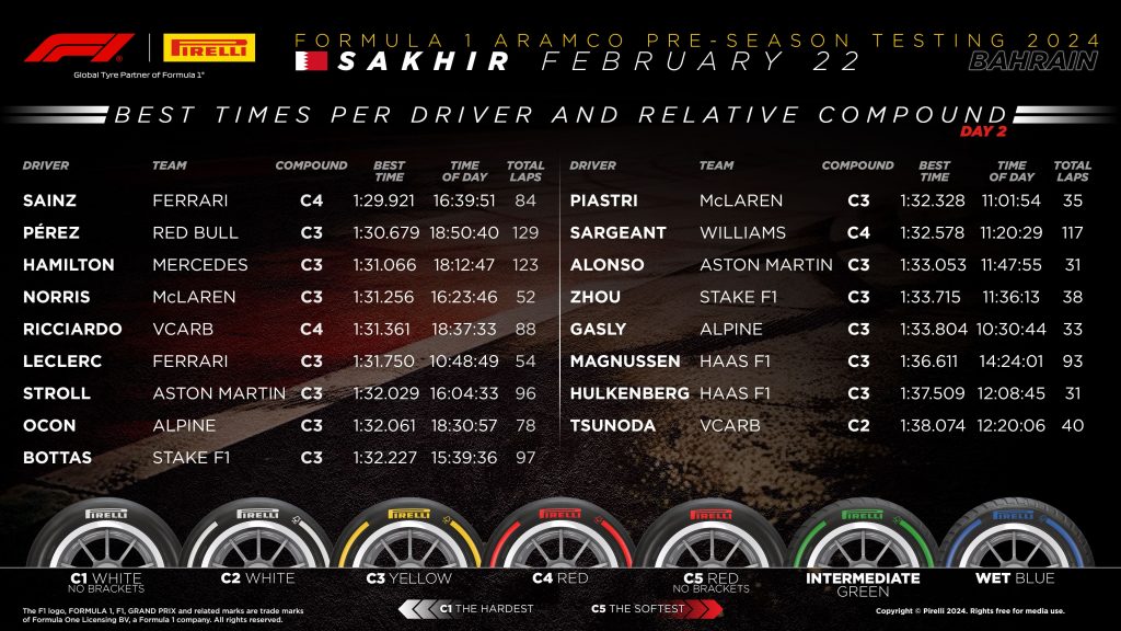 Sakhir, 22 de fevereiro – Os holofotes se viraram para a Ferrari no dia que acaba de terminar no circuito de Sakhir, no Bahrein. Seus dois pilotos lideraram a tabela de tempos tanto nas sessões da manhã quanto da tarde, primeiro com Charles Leclerc, que marcou 1min31s750, e depois com Carlos Sainz, que baixou para 1min29s931 à tarde, apenas dois décimos mais lentos que o tempo da pole position para o GP do Bahrein de 2023. O espanhol foi o único piloto a ficar abaixo da marca de 30 segundos, mais de sete décimos mais rápidos que o piloto seguinte, Sergio Perez, com 1min30s679 e mais de um segundo mais rápido do que o terceiro colocado Lewis Hamilton (1min31s066).