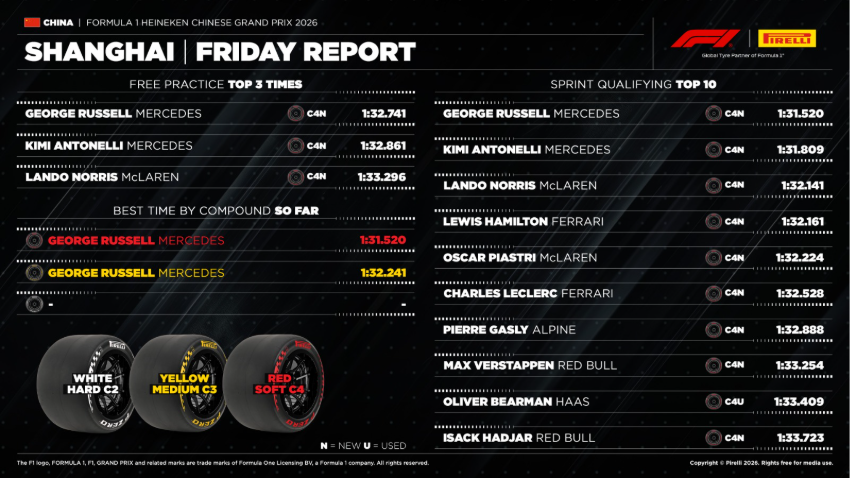 As temperaturas estão mais baixas do que no ano passado, a pista ainda está suja e com menos aderência do que veremos no domingo, à medida que a pista evolui. Como aconteceu no ano passado e como já era esperado, apareceu alguma granulação no pneu dianteiro esquerdo, o mais exigido pelas curvas de Xangai, e em menor grau também no dianteiro direito, embora o impacto no desgaste geral permaneça limitado. Neste circuito, as equipes tendem a priorizar a proteção do eixo dianteiro, deslocando o equilíbrio do carro o máximo possível para a traseira.