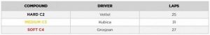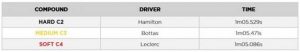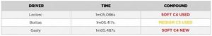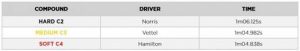• Em uma pista curta com volta tão rápida, atualmente existe uma lacuna de desempenho de sete décimos de segundo por volta entre os compostos macio e médio e meio segundo entre o médio e o duro.