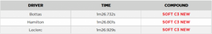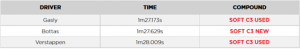 • O piloto da Mercedes, Valtteri Bottas, foi o mais rápido no TL2 com o pneu macio, enquanto Pierre Gasly, da Red Bull, usou o mesmo composto para ser mais veloz no TL1, no final da sessão.