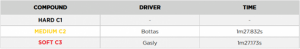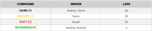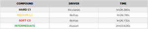 • Atualmente, há uma lacuna de desempenho de cerca de 0s7 entre os pneus macios e médios, enquanto a diferença entre os médios e duros é difícil de avaliar no momento.