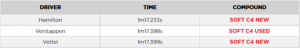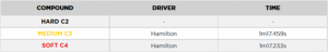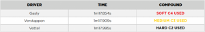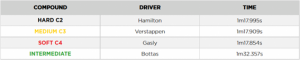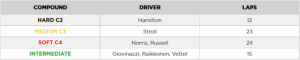 • Em um circuito curto como o Hungaroring, a diferença entre os compostos nunca é especialmente grande. Há uma diferença aproximada de cerca de sete décimos de segundo entre o macio e o médio, com intervalo de cerca de meio segundo entre médio e duro. No entanto, o uso limitado durante o dia tornou mais difícil obter uma leitura precisa.