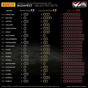 Milão, 23 de julho de 2019 – A Federação Internacional de Automobilismo (FIA) informou à Pirelli as escolhas de pneus de cada equipe para o Grande Prêmio da Hungria, que será realizado entre os dias dois e quatro de agosto de 2019.