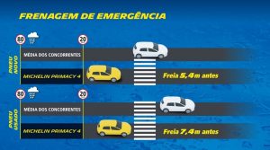 * Teste de frenagem em piso molhado de 80 a 20 km/h, realizado pelo TUV SUD por solicitação MICHELIN, entre junho e julho de 2017, com pneus 205/55 R16 montados em um Volkswagen GOLF VII 1.4 TSI, que compara o pneu MICHELIN PRIMACY 4 com os concorrentes BRIDGESTONE TURANZA ER300, CONTINENTAL POWERCONTACT, GOODYEAR EFFICIENT GRIP PERFORMANCE e PIRELLI CINTURATO P1 PLUS.