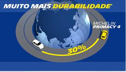*** Teste realizado pela DEKRA, entre Maio e Junho de 2017, na dimensão 205/55 R16 em veículos Audi A3 TFSI comparando MICHELIN PRIMACY 4 e seus principais concorrentes BRIDGESTONE TURANZA ER300 ; GOODYEAR EFFICIENT GRIP PERFORMANCE e PIRELLI CINTURATO P1 PLUS. Produtos comprados no mercado brasileiro. Cálculo de durabilidade baseado na média de 10.000km rodados por ano.