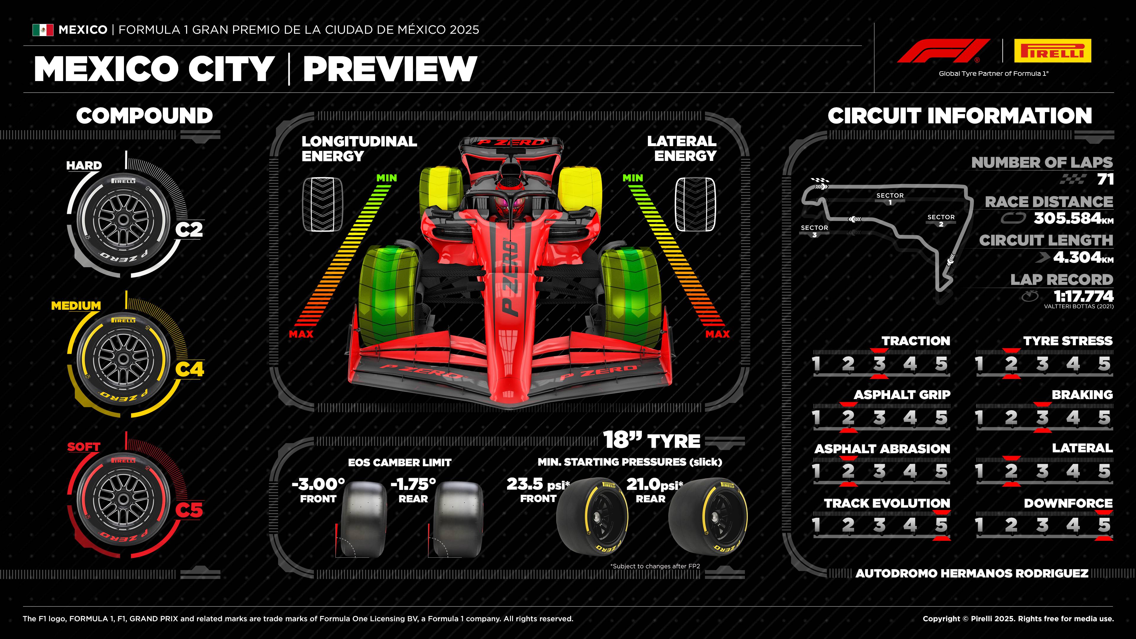 Assim como aconteceu em Austin no último fim de semana, para a etapa mexicana há novamente um salto na seleção de compostos entre o mais duro dos três e o médio. Enquanto o Médio e o Macio são, respectivamente, os C4 e C5, como em 2024, o Duro agora será o C2. Para o circuito da Cidade do México, esse composto é uma escolha extremamente conservadora, com uma diferença considerável em termos de tempo de volta em comparação com os outros dois, além de oferecer menos aderência.