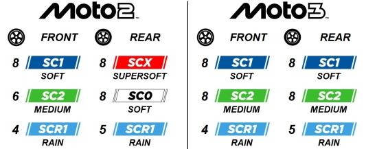 · Na Moto3, confirma-se a alocação padrão utilizada desde o ano passado. Em 2024, praticamente todos os pilotos na corrida utilizaram o pneu traseiro SC1 macio, enquanto na dianteira 15 dos 26 pilotos optaram por largar com o pneu SC2 médio, com os restantes optando pelo pneu SC1 macio.