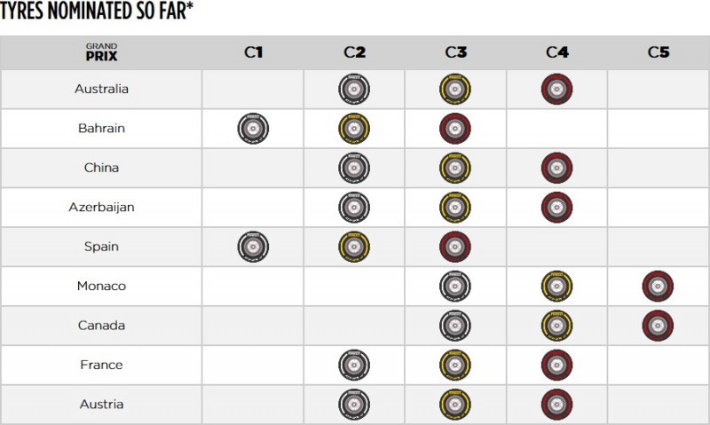 Apenas três cores em cada corrida de 2019, com cinco diferentes compostos disponíveis: C1 é o mais duro e o C5 o mais macio.