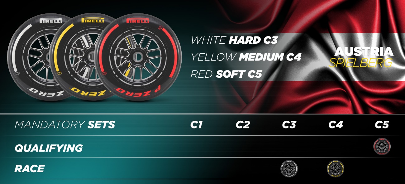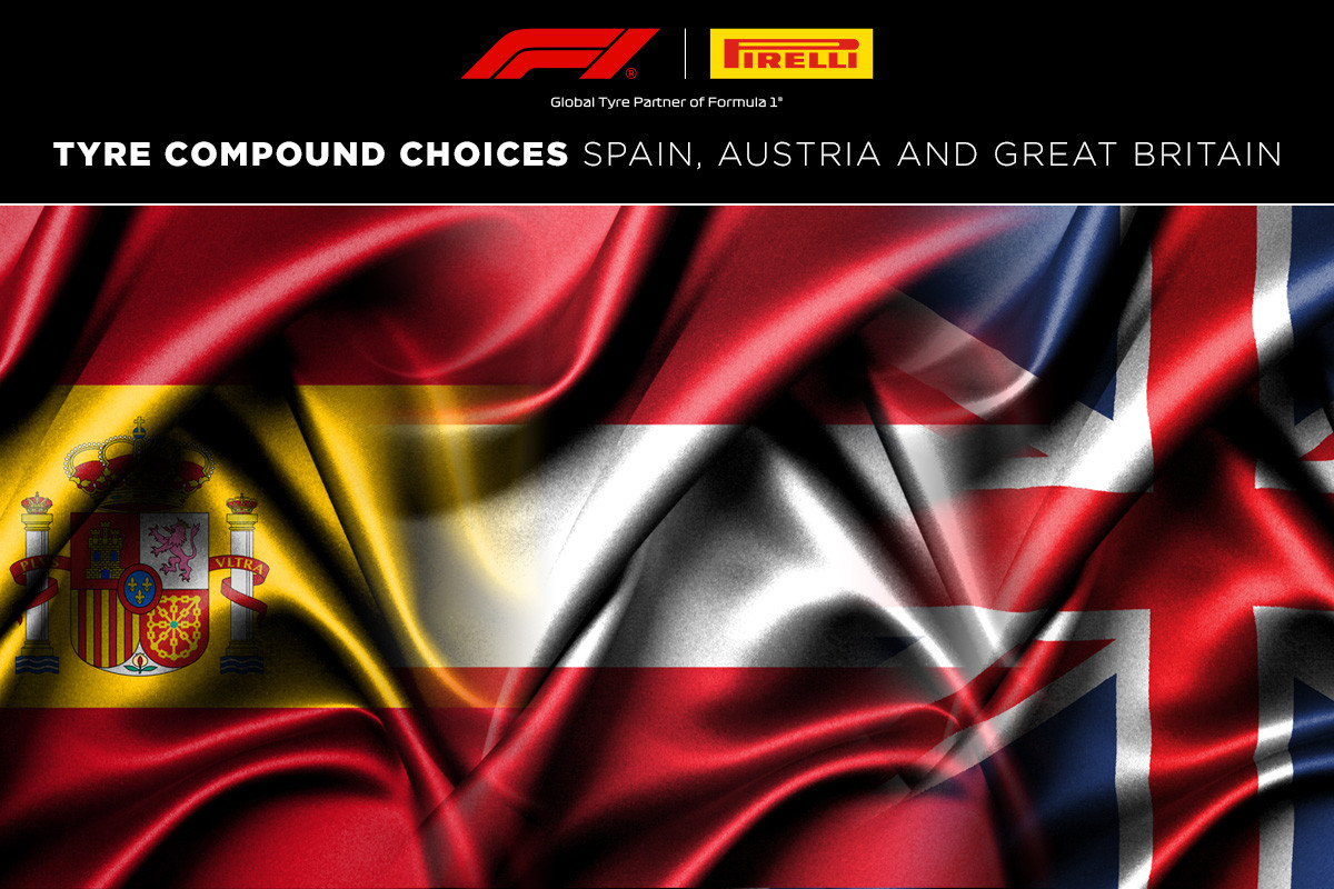 As escolhas da Pirelli são idênticas às do ano passado: os três compostos mais duros da gama (C1, C2 e C3) foram escolhidos para Barcelona e Silverstone, enquanto os mais macios (C3, C4 e C5) serão usados no Red Bull Ring. Na verdade, essas foram as únicas escolhas lógicas, já que as pistas espanhola e inglesa estão entre as mais difíceis em termos de estresse exercido sobre os pneus, por causa das muitas curvas de alta velocidade, enquanto a pista austríaca, que tem pouquíssimas (10) curvas e um dos tempos de volta mais curtos do calendário, tem características bastante semelhantes às de Montreal, em que C3, C4 e C5 são os compostos escolhidos.