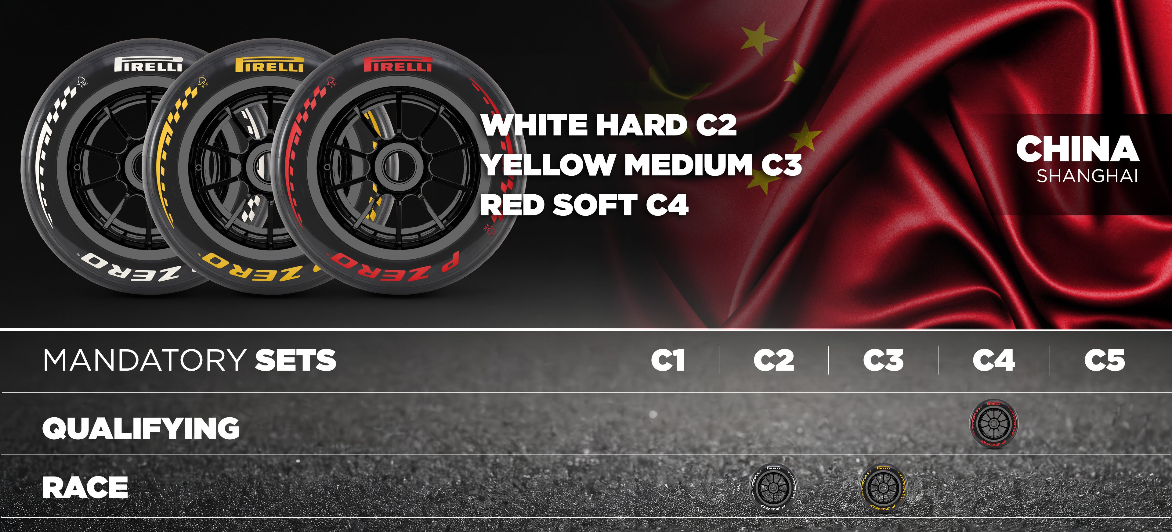Para Xangai, de 13 a 16 de março, foi selecionada a faixa intermediária de compostos: C2, C3 e C4. Neste ano, as equipes tiveram de lidar com um asfalto totalmente recapeado ao longo do traçado de 5,451 quilômetros. As exigências laterais e longitudinais sobre os pneus são próximas da média da temporada, com o lado esquerdo do carro sendo o mais solicitado em termos de desgaste. No próximo ano, Xangai voltará a sediar o primeiro fim de semana com Sprint.