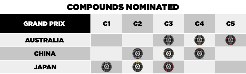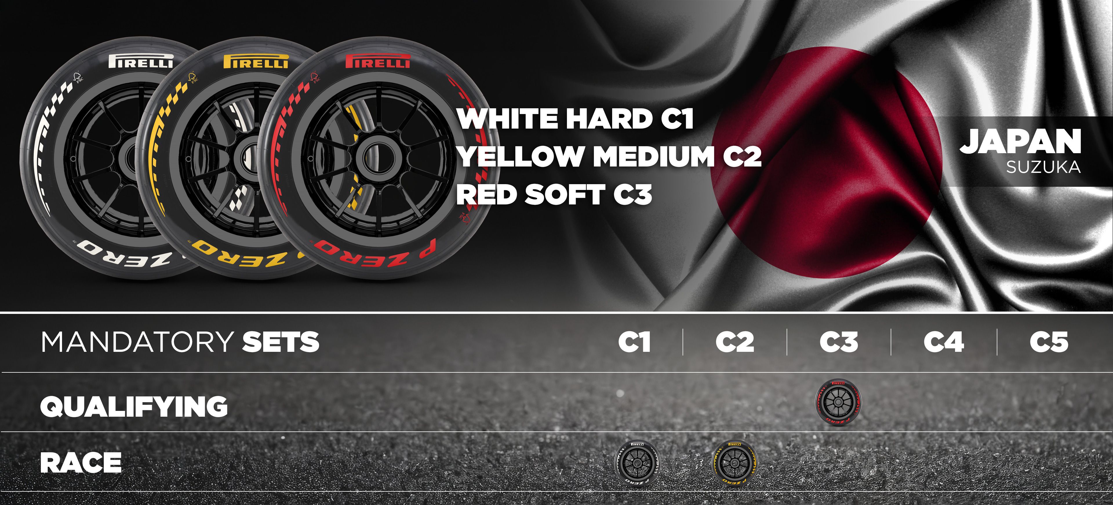 Suzuka, de 27 a 29 de março, é uma das pistas mais desafiadoras do ano para os pneus e, por isso, exige a seleção mais dura: C1, C2 e C3. Em 2025, as baixas temperaturas da pista e a maior resistência a granulação permitiram que os pilotos estendessem seus stints com os pneus Duro e Médio, realizando apenas uma parada. A situação foi diferente em 2024, quando a degradação térmica levou a pelo menos duas paradas.