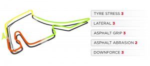 • Não houve mudança significativa na pista ou asfalto este ano, que é médio em termos de energia carregada e abrasividade. A evolução da pista ao longo do fim de semana geralmente é bastante baixa.