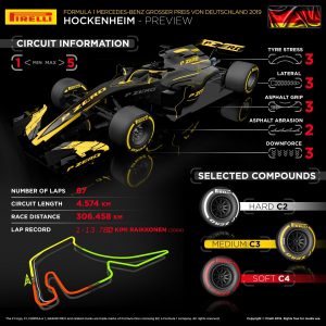 “Hockenheim não é uma pista que as equipes estão historicamente completamente familiarizadas. Durante muitos anos alternou com Nurburgring e, em seguida, deixou o calendário, antes de retornar no ano passado. No entanto, não há nada sobre a pista que podemos chamar de surpresa, com as demandas e forças sobre os pneus sendo equilibradas. A exceção é a seção do estádio, chamada de Motodrom, que é um pouco mais travada, enquanto outra coisa que precisa ser levada em conta é a inclinação das curvas 12 e 13. O desgaste e a degradação são geralmente baixos então, no passado, já vimos alguns períodos entre trocas de pneus bem longos. Como vimos no ano passado, o clima é difícil de prever em Hockenheim nesta época do ano e isso certamente é um elemento chave que influencia a estratégia”.