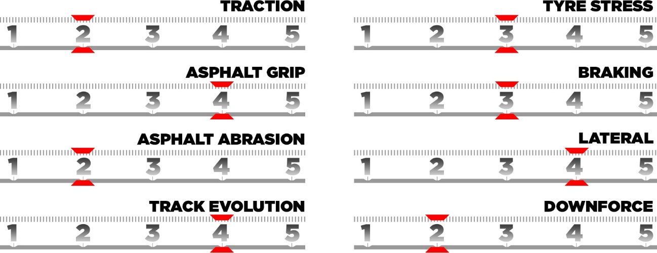 A superfície da pista não é muito abrasiva, com um nível médio de aspereza, mas as forças laterais exercidas sobre os pneus são consideráveis, embora não no nível encontrado em Suzuka ou Barcelona, por exemplo. A granulação pode aparecer, especialmente nas primeiras sessões de treinos livres, já que a pista é muito suja no início, pois raramente é utilizada para corridas de automóveis. No entanto, com várias categorias de apoio também correndo, as condições da pista melhoram ao longo do fim de semana, de modo que esse fenômeno diminui. Entretanto, com um trio de compostos mais macios este ano, será interessante ver o efeito que isso terá.
