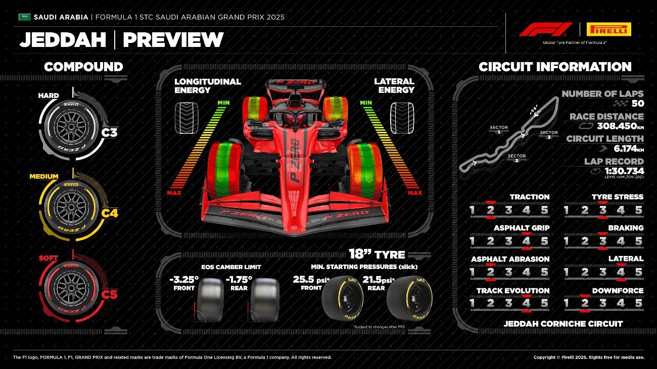 A escolha dos compostos para as quatro primeiras corridas desta temporada foi a mesma do ano passado, mas para a quinta rodada, a Pirelli deu um passo mais macio, com o C3 como Duro, o C4 como Médio e o C5 como Macio sendo o trio disponível em Jeddah. Isso está de acordo com a meta, compartilhada com a FIA, a F1 e as equipes, de criar mais opções de estratégia para a corrida e, portanto, uma corrida mais emocionante e imprevisível. Nas quatro edições anteriores desse GP, a estratégia de uma parada única sempre dominou, tanto em termos de eficácia quanto de preferência das equipes, mesmo quando um Safety Car misturou um pouco mais as coisas.