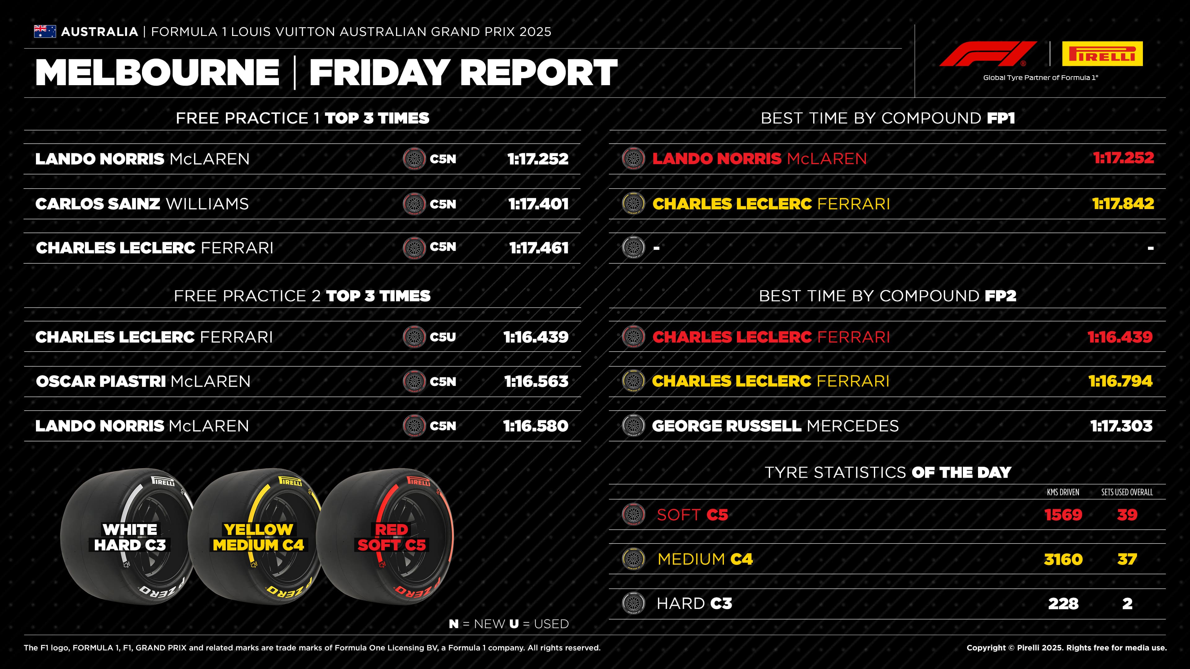 Já se passou pouco menos de um ano desde o GP da Austrália de 2024, mas o resultado do primeiro dia de treinos livres continua o mesmo, com Lando Norris mais rápido no TL1 e Charles Leclerc mais rápido no geral.