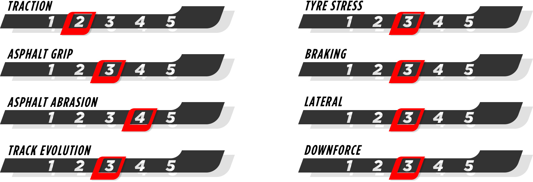 Como habitual neste evento, a Pirelli escolheu os três compostos mais macios da gama de 2024, o C3 como Duro, o C4 como Médio e o C5 como Macio. A superfície da pista de Spielberg é um tanto antiga e, portanto, altamente abrasiva, mas as forças laterais exercidas sobre os pneus são definitivamente abaixo da média da temporada, resultando num desgaste geral muito limitado. A tração nas curvas lentas e a estabilidade nas frenagens são fatores-chave para ser competitivo nesta pista. É importante administrar os pneus para evitar o superaquecimento, principalmente se rodarem em altas velocidades: os pilotos que não conseguirem mantê-los suficientemente frios podem ter dificuldade em se defender dos ataques de outros carros, especialmente no primeiro e no último setores. Portanto, outro fator importante será a temperatura ambiente num local onde o clima é frequentemente bastante variável. Nas duas últimas edições desta corrida, a estratégia de duas paradas se provou a mais rápida com pneus médios e duros e, no ano passado, nenhum piloto apostou nos macios.