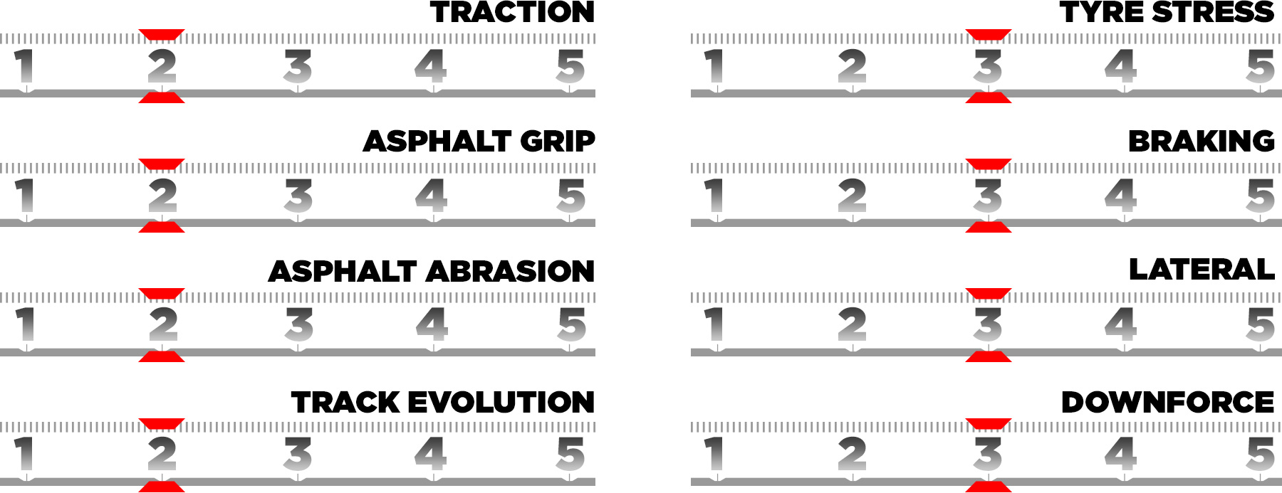 O gerenciamento dos pneus é afetado pelos muitos pontos de aceleração e frenagem, com os pneus sujeitos a uma baixa carga média e degradação limitada. No entanto, as zebras altas podem aumentar o estresse mecânico, especialmente na suspensão e nos pneus. Devido às oportunidades limitadas de ultrapassagem, a classificação desempenha um papel importante, bem como encontrar a estratégia correta para a corrida.