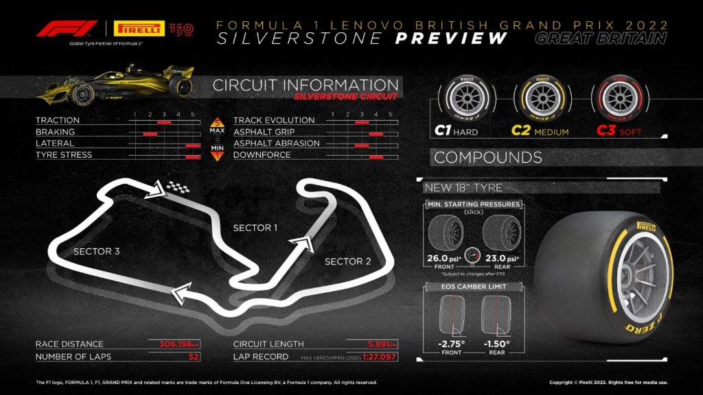 • Juntamente com Suzuka, no Japão, e Spa, na Bélgica, Silverstone coloca as maiores exigências aos pneus durante todo o ano, razão pela qual os compostos mais duros da gama foram nomeados: C1 como P Zero Branco duro, C2 como P Zero Amarelo médio, e C3 como o P Zero Vermelho macio. Esta é a terceira vez que esta combinação é nomeada durante o ano.