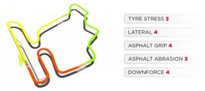 • As temperaturas médias tendem a estar entre as mais altas da temporada. Isto aumenta não só a degradação térmica, mas faz a vida mais difícil para os pilotos, porque a média baixa de velocidade (bem como a localização geográfica da pista) significa que há pouco fluxo de ar passando pelo carro.