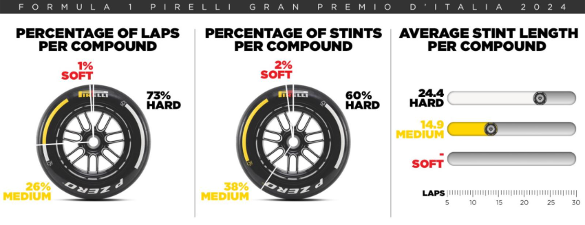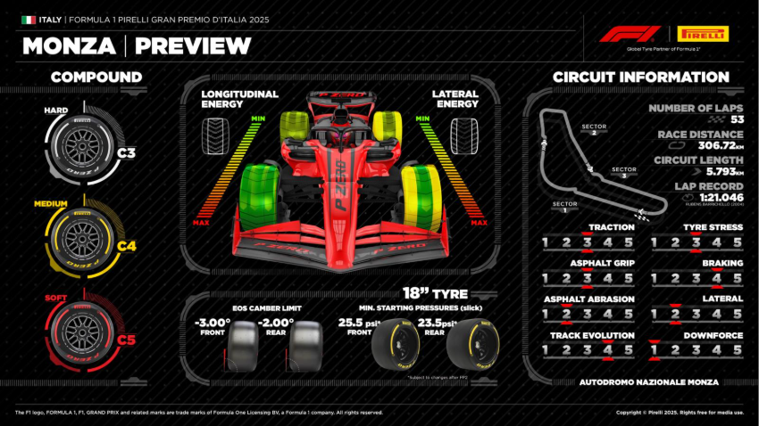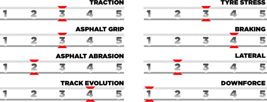 Não houve mudança nos compostos em relação ao ano passado, quando a pista havia acabado de ser recapeada para o GP da Itália, no Autodromo Nazionale di Monza. O C3 será o Duro, o C4 o Médio e o C5 o Macio. Doze meses depois, inevitavelmente a superfície já estará mais envelhecida, mas isso dificilmente terá efeito significativo na gama de estratégias possíveis neste circuito, onde os carros correm com o nível mais baixo de downforce aerodinâmico da temporada.
