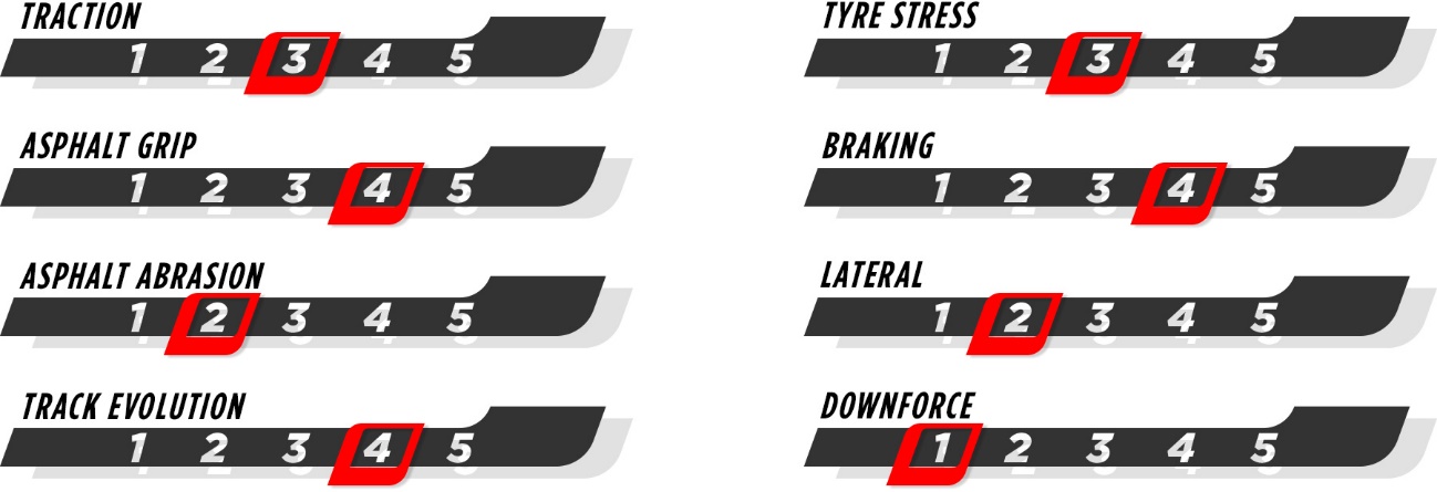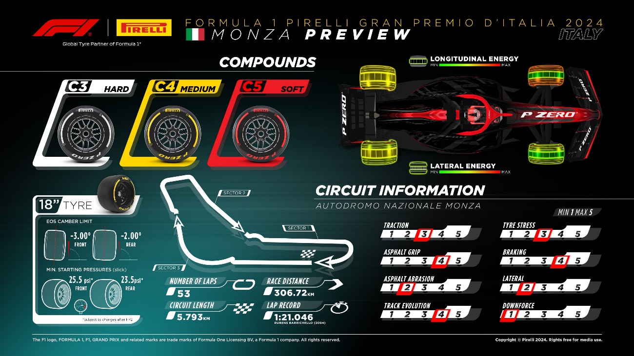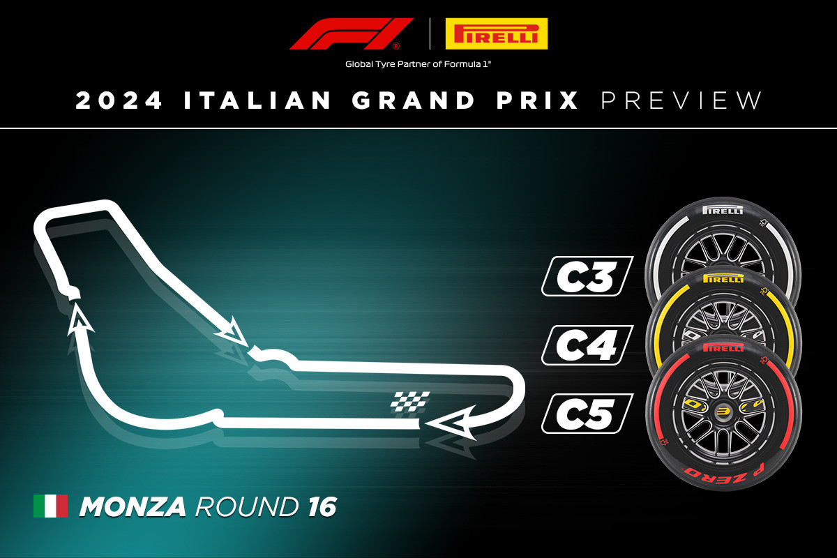 Em Monza, os carros geralmente correm na configuração aerodinâmica mais baixa da temporada para reduzir o arrasto, a fim de favorecer a velocidade máxima. A estabilidade na frenagem e a tração na saída das duas chicanes são os fatores que mais testam os pneus e, além disso, as cargas laterais nas curvas rápidas, como a Parabolica, agora nomeada em homenagem a Michele Alboreto, e a Curva Grande, não devem ser subestimadas. Para o evento deste ano, os três compostos para pista seca são os mesmos de 2023: C3 como Duro, C4 como Médio e C5 como Macio.
