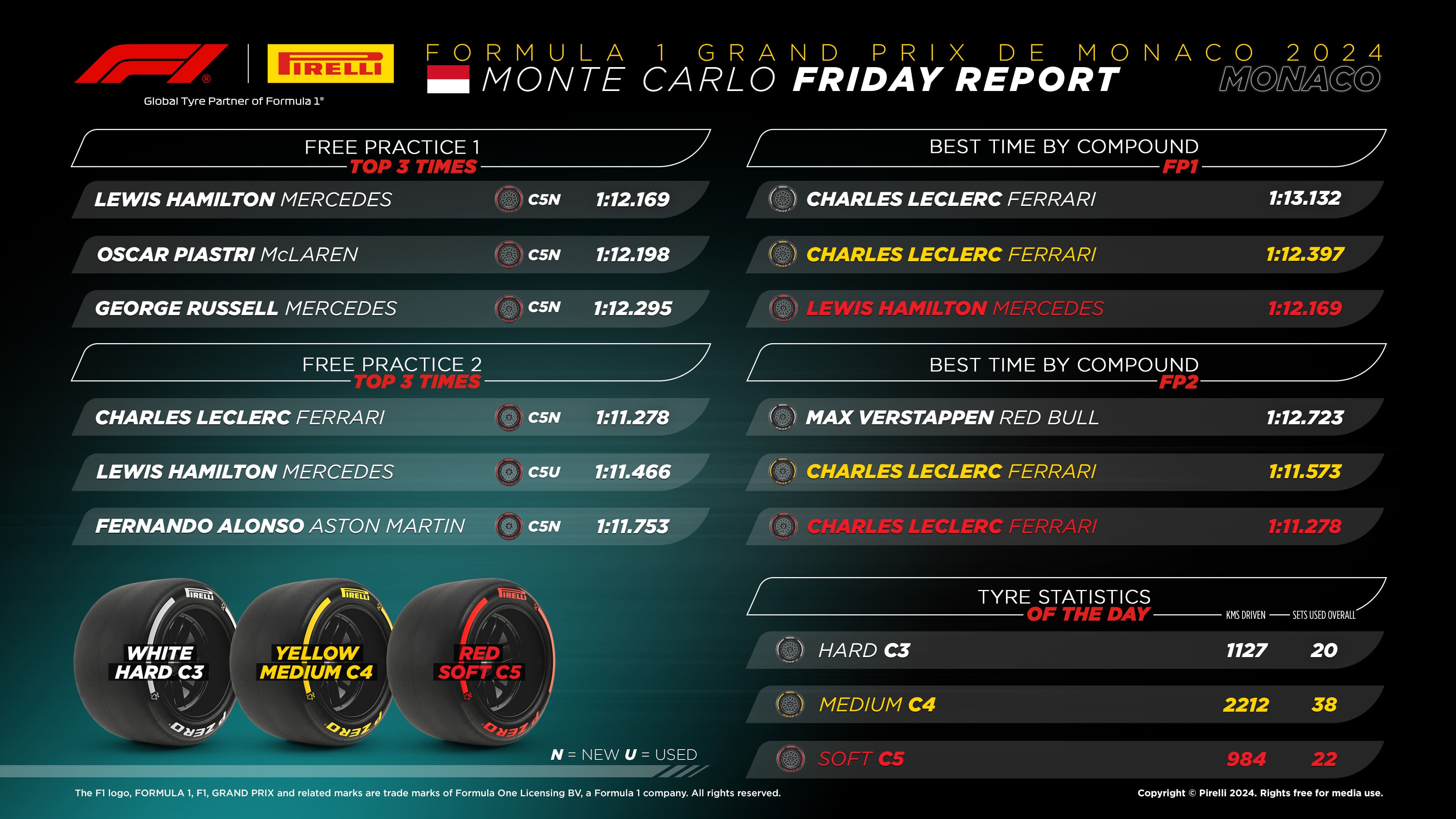 Como costuma acontecer nos treinos livres de Mônaco, os pilotos tentaram fazer o máximo possível de voltas para ganhar confiança ao lidar com os desafios únicos desta pista. Entre eles, os 20 pilotos percorreram 1.180 voltas, ou quase quatro mil quilômetros, 3.937,66 para ser pais preciso. O composto mais popular foi o C4 (600 voltas), seguido pelo C3 (314) e depois pelo C5 (266).