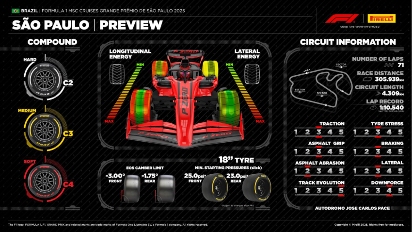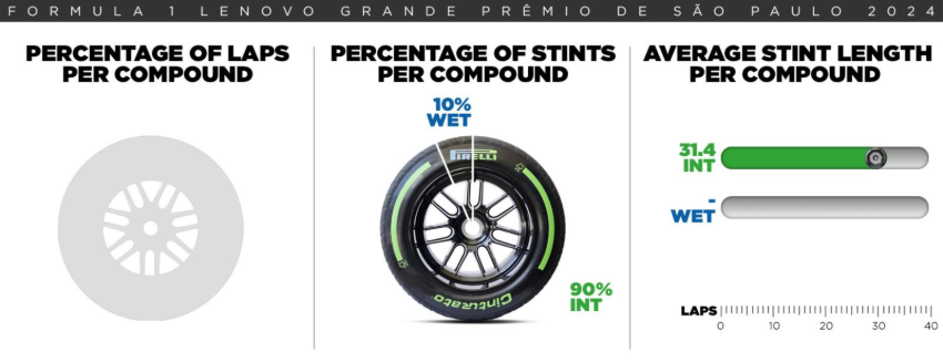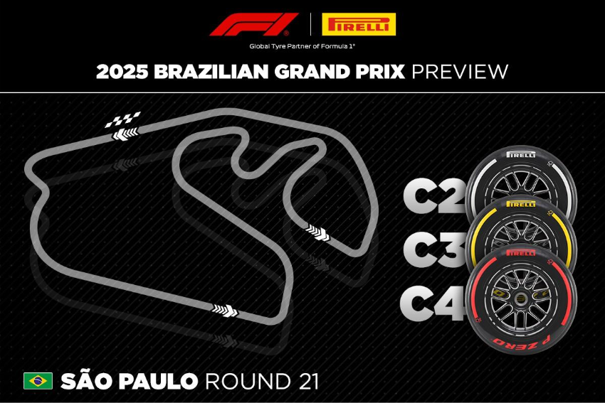 A seleção de compostos deste ano para o GP de São Paulo remete a 2023, com o C2, C3 e C4 como Duro, Médio e Macio, portanto, um passo mais duro do que o trio usado no ano passado.