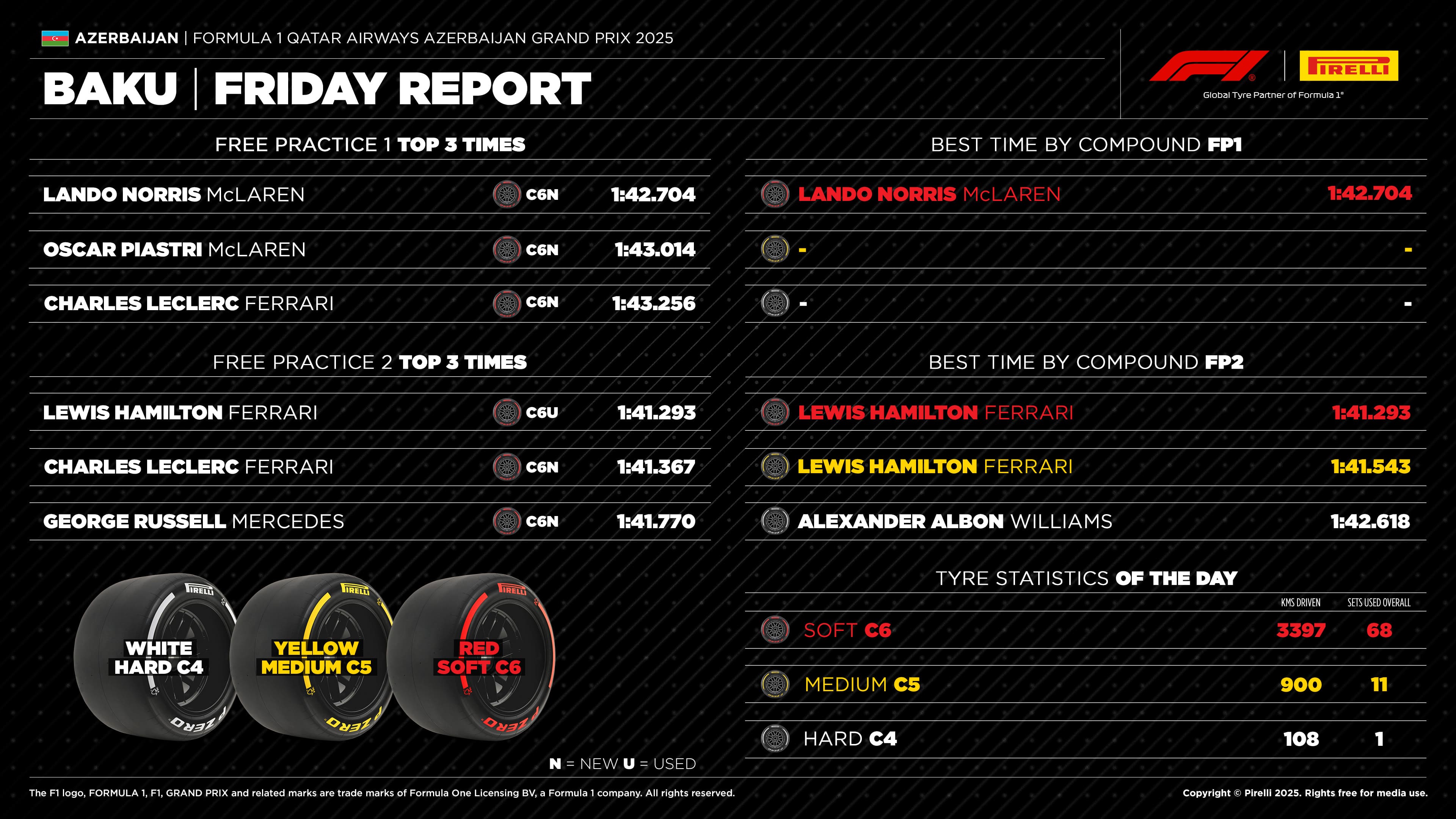 Vermelha também foi a cor do pneu que mais trabalhou hoje, com o C6 completando 566 voltas (77,11%). Na verdade, no TL1, o Macio foi o único pneu utilizado, algo que não havia acontecido na primeira sessão de treinos livres desde 2019. A utilização antecipada de tantos conjuntos de Macios nesta sexta-feira é uma indicação clara de que as equipes estão interessadas em ter, também, pneus Médios disponíveis para a classificação.