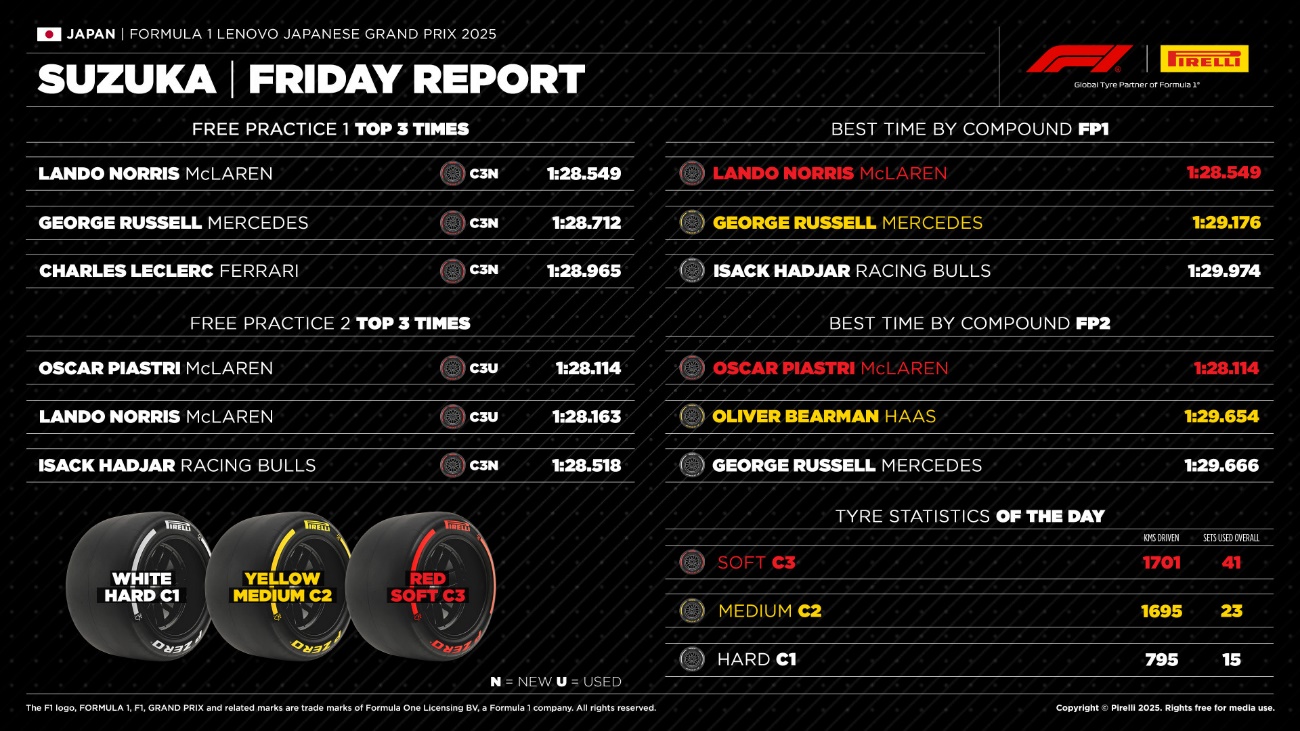 Oscar Piastri estabeleceu o melhor tempo no primeiro dia de treinos livres para o GP do Japão. O piloto australiano da McLaren liderou a tabela de tempos da segunda sessão com uma volta em 1min28s114, 83 milésimos abaixo do tempo da pole position estabelecido em 2024 por Max Verstappen na Red Bull. A McLaren também esteve no topo na primeira sessão, a única das duas em que não houve interrupções no tempo de pista, com Lando Norris sendo o mais rápido com 1m28s549s.