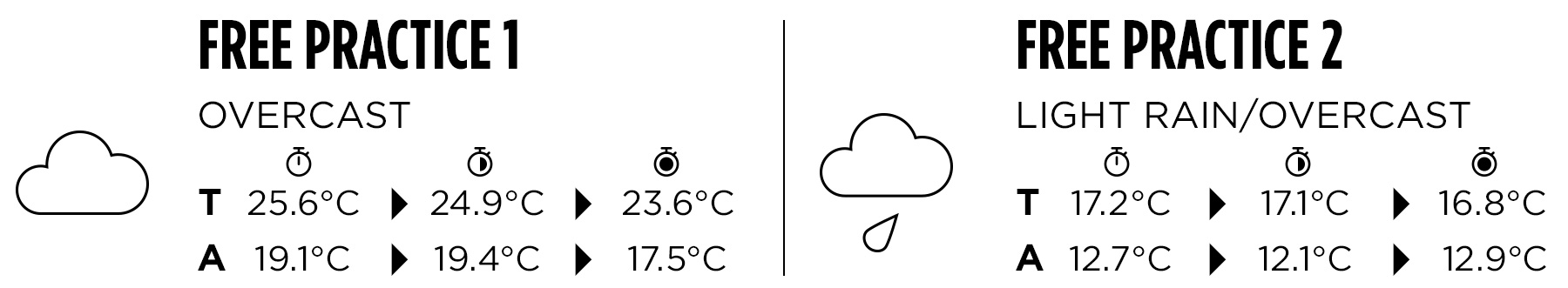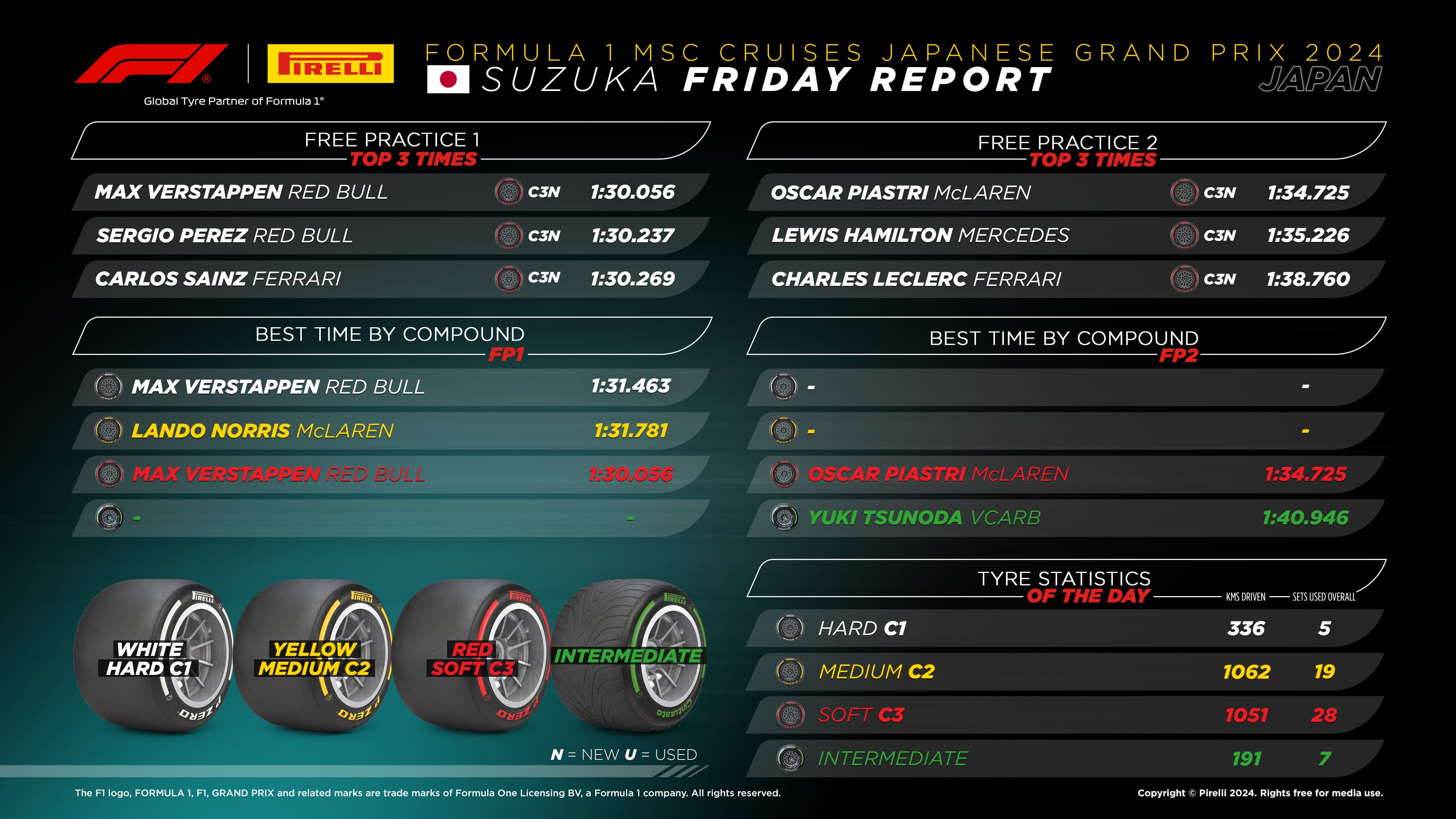“No fim das contas, apenas a primeira hora de treinos livres produziu dados úteis sobre o comportamento dos pneus nesta pista muito exigente de Suzuka. A segunda sessão foi prejudicada pela chuva intermitente, o que fez com que a superfície da pista nunca estivesse seca o bastante para proporcionar aderência suficiente para os pilotos forçarem os slicks, nem molhada o suficiente para poder avaliar completamente o comportamento dos intermediários, muito menos para identificar o ponto de transição deste pneu para os pneus de pista seca.