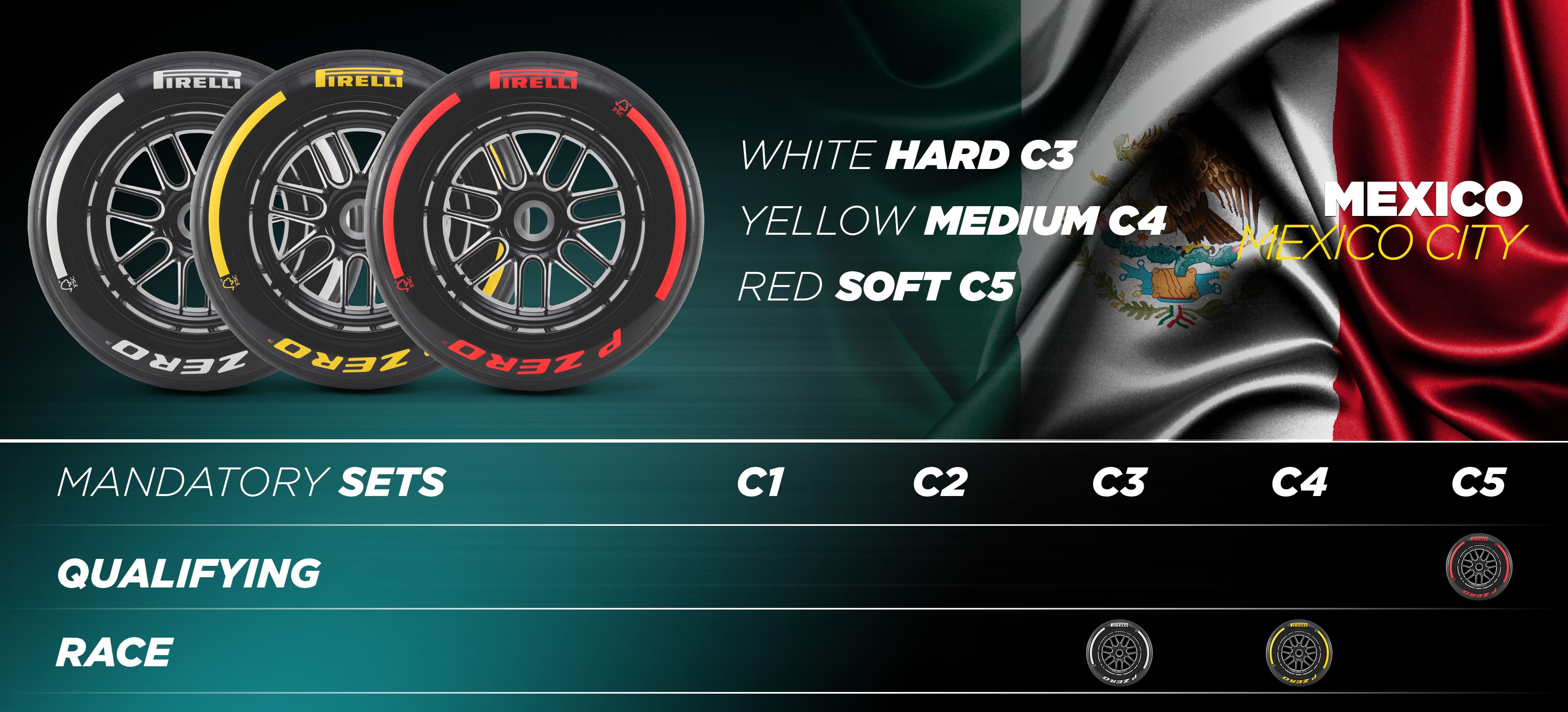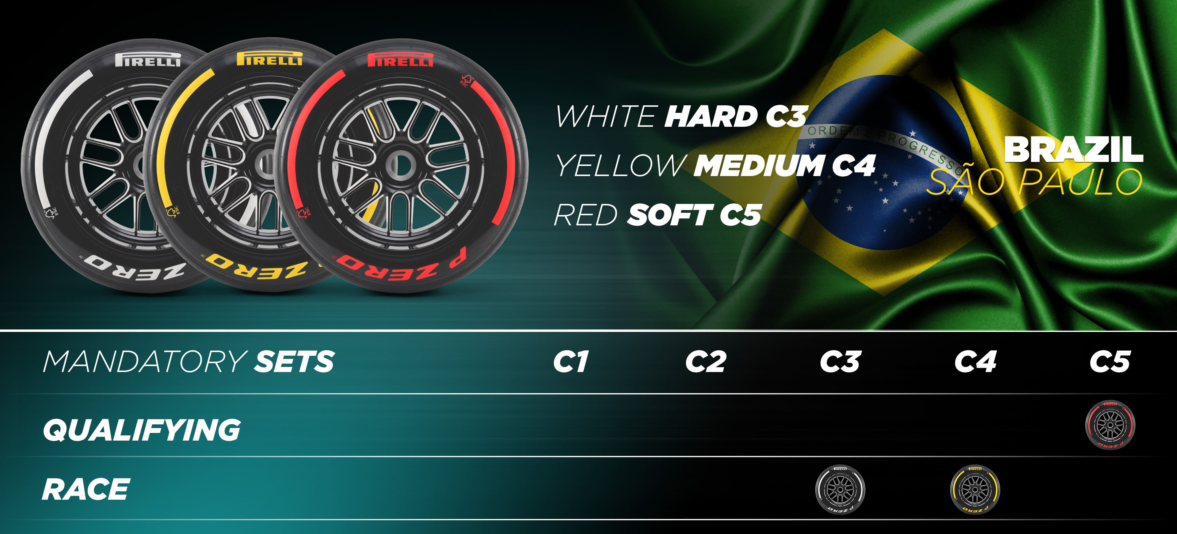 Cidade do México (25-27 de outubro) e São Paulo (1-3 de novembro) terão os três compostos mais macios da gama: C3 como P Zero Branco duro, C4 como P Zero Amarelo médio e C5 como P Zero Vermelho macio. Embora a escolha para o circuito dedicado à memória dos irmãos Rodriguez, Pedro e Ricardo, seja idêntica à de 2023, passando para a pista de Interlagos, isso representa uma mudança. No Brasil em 2023, as equipes poderiam utilizar o C2 como duro, o C3 como médio e o C4 como macio. O mais duro deles nunca foi usado, com todos os pilotos fazendo uma corrida de duas paradas alternando o médio e o macio. Um passo mais macio, portanto, deve oferecer mais opções de estratégia. Além disso, há um trabalho de recapeamento sendo realizado na pista brasileira, o que adiciona outro conjunto de fatores desconhecidos. Sexta-feira será, portanto, mais importante do que nunca para avaliar o comportamento dos pneus, tendo em mente que os níveis de aderência mudarão muito rapidamente ao longo de todo o fim de semana.
