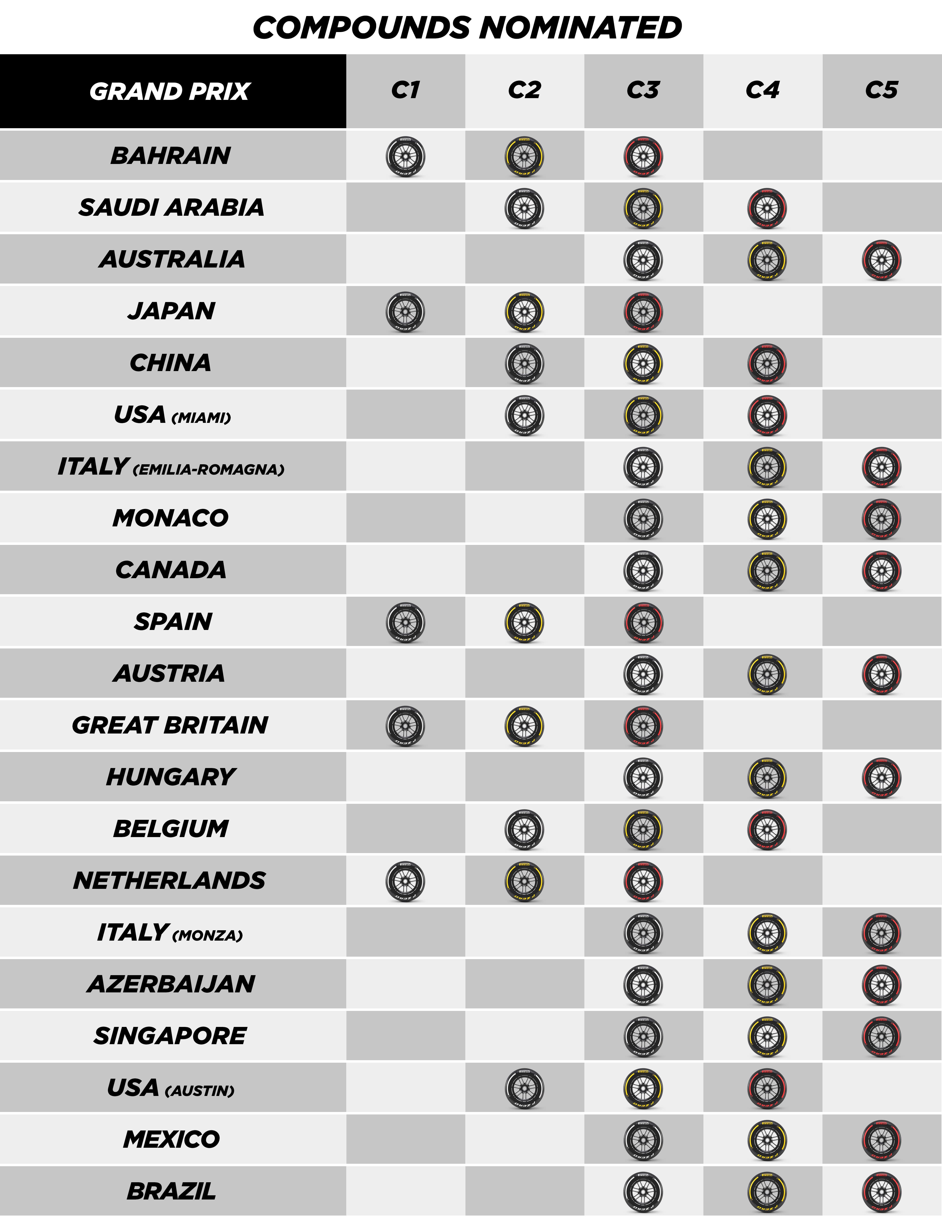 A Pirelli informou às dez equipes que participam do Mundial de Fórmula 1 da FIA quais compostos estarão disponíveis para a longa fase da temporada no continente americano, com três corridas em três países em finais de semana consecutivos, duas na América do Norte e uma na América do Sul.