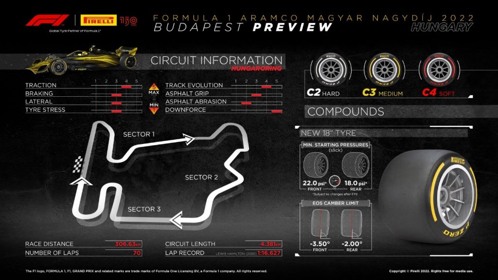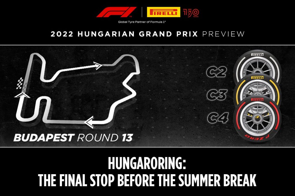 • O GP da Hungria marca a metade do ano antes das férias de verão, e a Pirelli escolheu os pneus do meio da gama: C2 como o P Zero Branco duro, C3 como o P Zero Amarelo médio, C4 como o P Zero Vermelho macio.
