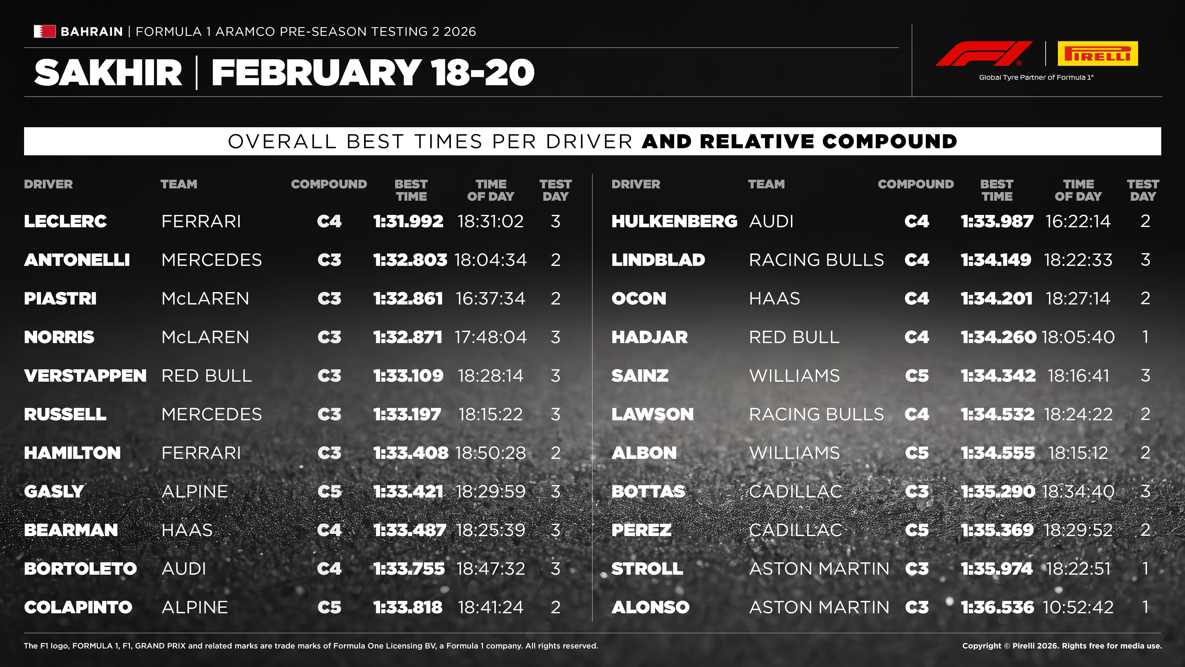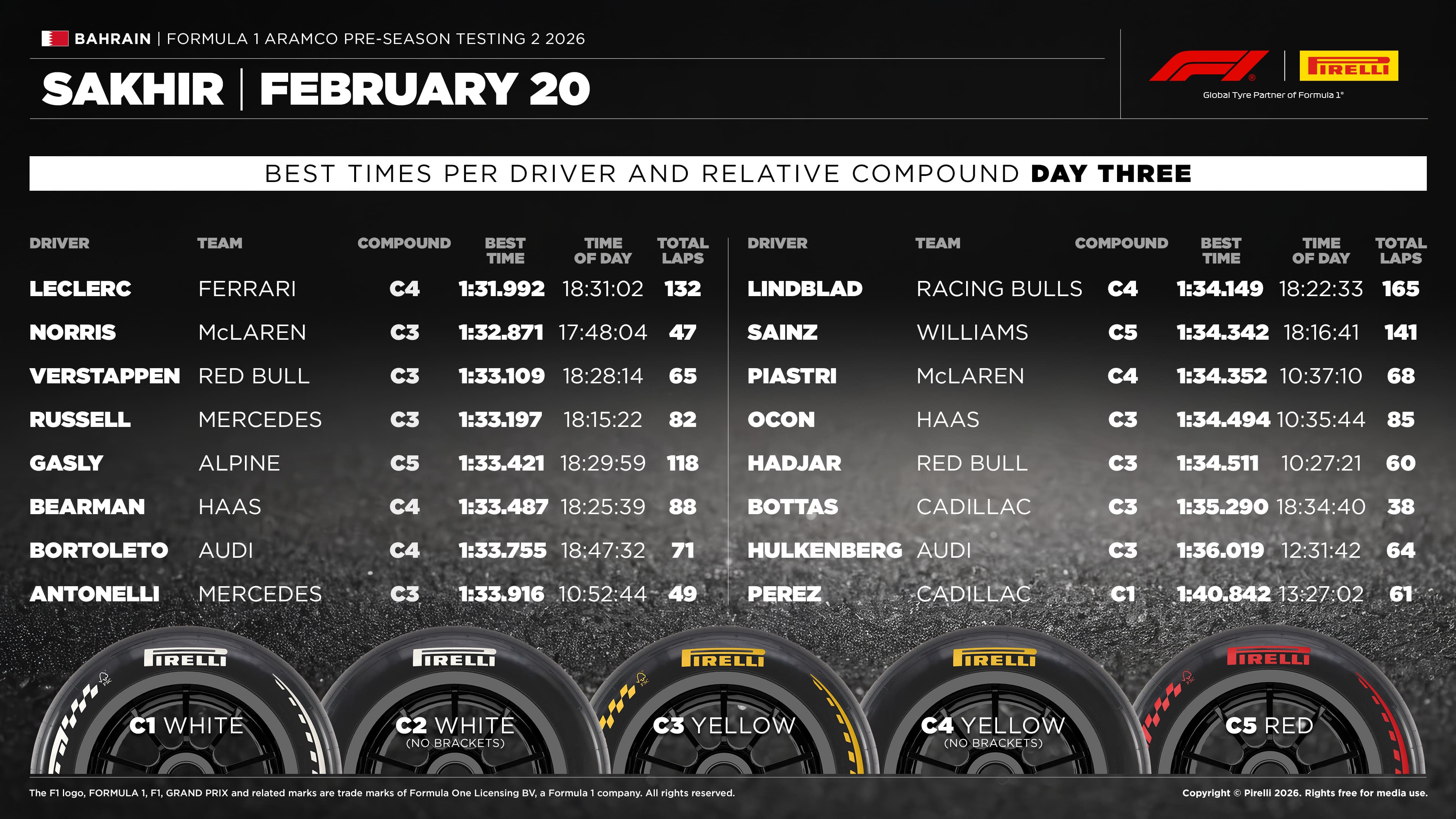 O tempo mais rápido de todos os seis dias de testes de pré-temporada no Bahrein foi estabelecido durante a última hora no circuito de Sakhir utilizando os novos pneus Pirelli. Charles Leclerc (Ferrari) melhorou em oito décimos de segundo a marca estabelecida ontem por Kimi Antonelli, encerrando as duas semanas de sessões com um tempo de 1min31s992 com o composto C4.