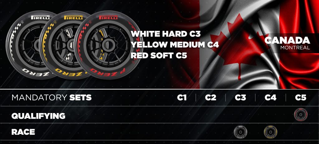 No Canadá (22 a 24 de maio), também será utilizada a seleção mais macia graças a uma superfície de pista pouco abrasiva e para proporcionar aderência adequada nas zonas onde os carros são submetidos a forte desaceleração. No ano passado, quando a gama se estendia até o C6, o trio que incluía essa opção foi utilizado, embora o que era então o composto Macio tenha ficado à margem das estratégias de corrida, que já estavam voltadas para duas paradas utilizando apenas o Duro e o Médio. Em comparação com Miami, Montreal também traz a variável climática para o jogo, especialmente devido à data mais precoce no calendário.