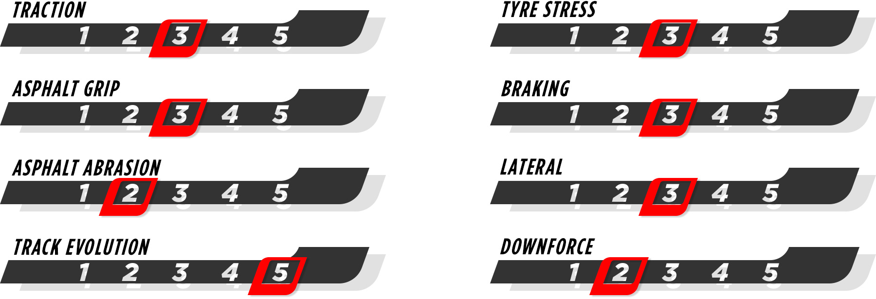 Os três compostos de pneus para pista seca escolhidos pela Pirelli para esta etapa estão na faixa intermediária: C2 como Duro, C3 como Médio e C4 como Macio. A pista foi recapeada antes da corrida do ano passado e é muito lisa, oferecendo, portanto, uma aderência bem baixa, uma característica agravada pelo fato de não ser utilizada para qualquer outro evento de motorsport. Isso leva a uma evolução muito significativa e a granulação pode aparecer, especialmente com os pneus Médios e Macios.